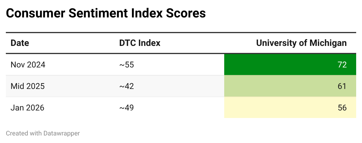 Multiple Consumer Sentiment Indices confirm that the general population’s outlook on the economy has worsened. The Yotpo DTC Index, while relatively new and measuring performance of major, publicly traded DTC brands, also showed slight declines from 2025 to 2026.